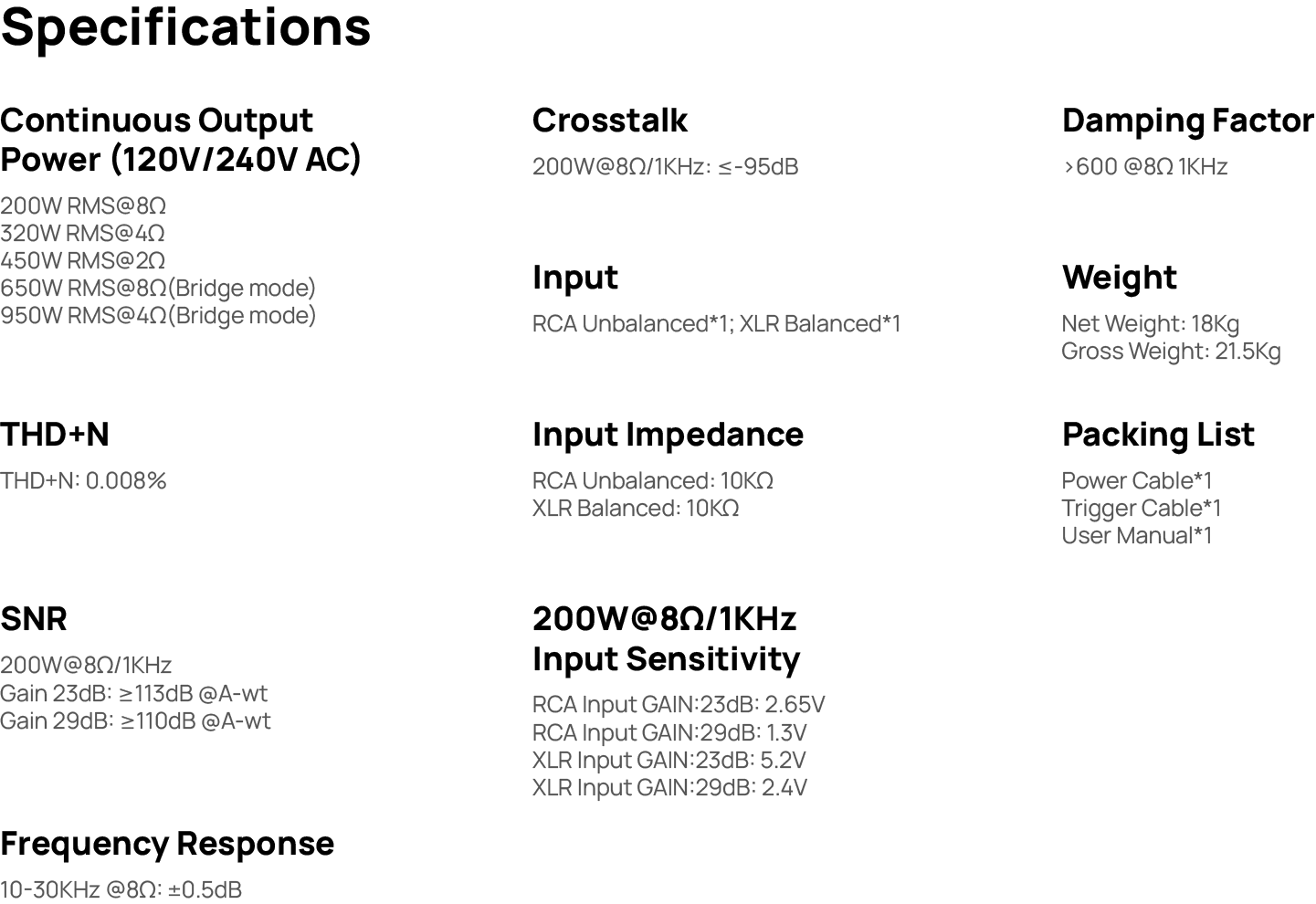 - SNR - 200 W @ 8 Ω / 1 kHz | Gain 23 dB: ≥113 dB (A-wt), Gain 29 dB: ≥110 dB (A-wt)
